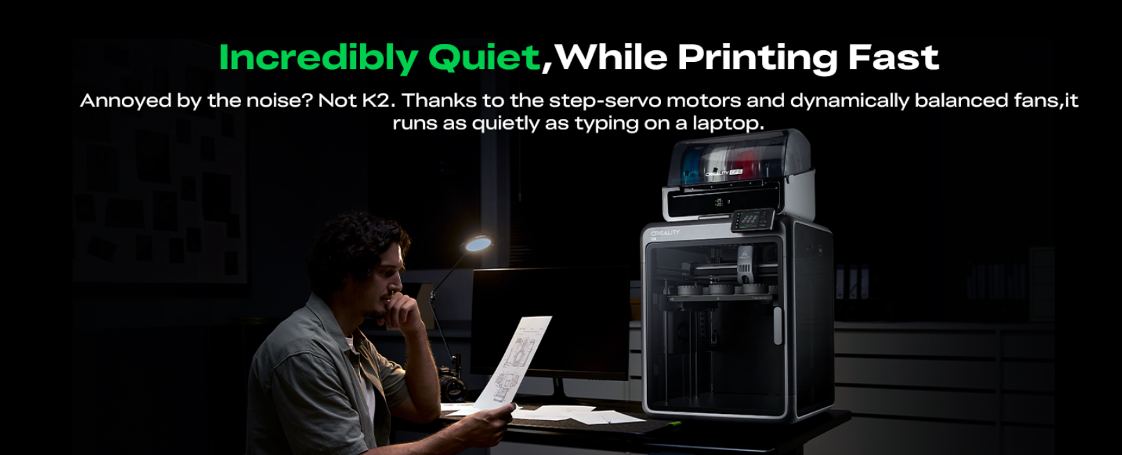 Благодаря бесшумным двигателям и продуманной конструкции Creality K2 Combo работает практически незаметно. Его можно использовать в офисах, студиях или мастерских без лишнего шума, что делает его удобным для совместных пространств.